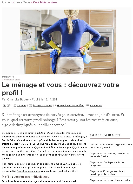 SweetHome, spécialiste du ménage à domicile, remercie Côtémaison.fr qui aime et explique les « profils ménage » que SweetHome met en avant.