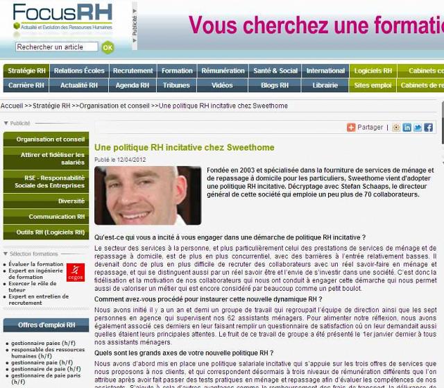 Nous remercions l’équipe de www.focusrh.com qui s’est intéressée à la politique salariale de SweetHome. En effet, dans un secteur très concurrentiel, SweetHome a mis en place une politique salariale incitative et innovatrice afin d’attirer et fidéliser des assistants ménagers, femmes de ménage et aides ménagères qualifiés.